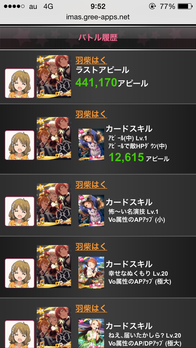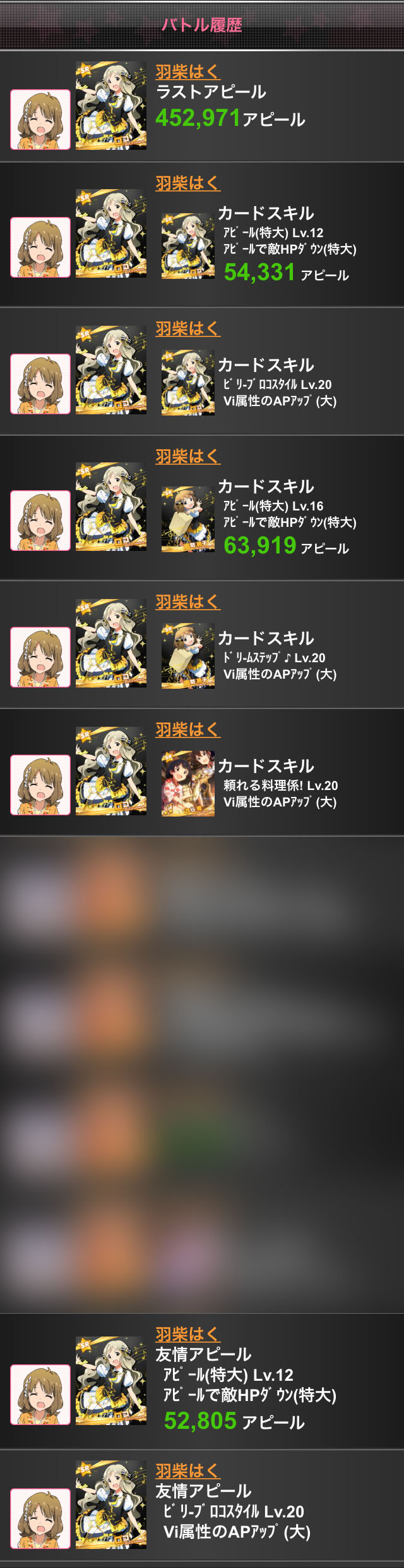 羽柴は特大アピールの威力に慣れてしまっているのでどうしても連続アピールをガード割り用として考えてしまうが、APDPの高いカードの継承したりレベルを上げるなどの工夫をする事で通常ライブバトルでも使用できる物になるのかもしれない