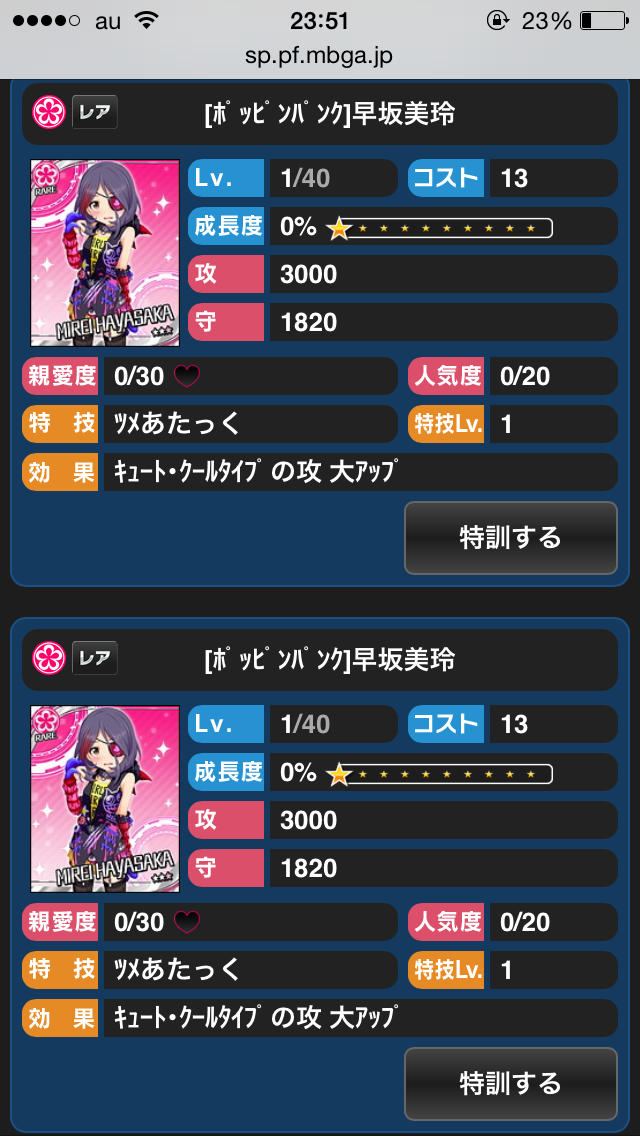 シンデレラガールズは、同じカードを2枚で「特訓」してより強いカードになります。