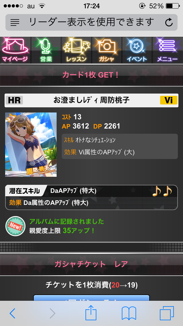 小~中:あまり効果が望めない 大~特:極大までの繋ぎではあるが、効果は目に見えて現れる 極大:サイキョー(思考停止) 全色:属性を選ばない点では優秀だが単色より効果は劣る 単色:メインで使っている属性の大~特大が引けたら幸運 単色極大:メインの属性ならあとは継承して伸ばすだけ。 ☆自分アップ 効果が低いので採用する意味はない(個人の感想です) ☆APアップ、APDPアップ 潜在を持たない極大があるなら、「とりあえず継承」しておくだけで デッキが簡単にパワーアップする。 片面には片面を両面には両面をつけて置くと変に迷わなくて良い。かも。 ・最大火力を求める場合は単色片面極大に潜在単色片面極大 ・SPアピールと最も相性が良いゲストは単色両面極大に潜在単色両面極大 ・DPを求められるイベントも増えてきたので片・片よりも両・両の方が需要がある ☆DPアップ 有効かどうかが相手次第なので、少々扱い難い。 ・ライバルが強力なアピールをして来る時に本領を発揮 ・ライバルスキル「APDP反転」の時はアピール値上昇として活躍 ☆アピール この潜在を持つカードのAPDPからアピール値が算出される為 19コストSR向きの潜在スキル。 APDPが低めに設定されている極大カードには向かない。 ・特大以上で片・片よりも総合アピール値が上回る (デッキにより差異が出る可能性があります) (片・片は単色片面極大に潜在単色片面極大の略です) ・減少や反転のライバルスキルの影響を受けないのが強み ・基本的には19コスト片面大に継承させる ・反転の時は両面大に継承させた方が総合アピールは高い →威力 特大1LVでカードのAPDPの合計値くらいのアピールを出します。 BMD(APDP計25,885)なら1Lvで27,964。レベルが上がると2,400程上昇 ★ライバルスキルに対応した潜在 ・全リセット/ライバルスキル:APダウン 連携スキルなどもリセットするので、かなり使い難い。 減らされた分よりもアップさせる方法でも対応可能?? ・ライバルリセット/ライバルスキル:APアップ 相手によってはただのAPアップ小。 相手のアピールよりもDPをアップさせる方法でも対応可能?? ・継続ダウン解除/継続ダウン 相手によってはただのAPアップ小。 減らされた分よりもアップさせる方法でも対応可能?? ・4連続アピール/ライバルスキル:アピールガード3Lv 極大カードが継承してもそこそこの火力が出る(1Lvで1万程度)ので [上記3点に比べれば]通常のライブバトルでも使えるスキル。 ガードを破るだけなら、2連続アピールを2人で行う事で対応可能。 その分、潜在の枠が削られるので潜在が揃っているPには結構痛い。 ★ゲスト ゲストのスキルは本来の効果よりも減少します。 正確な値はわかりませんが、 ゲストで読んでもらったBMD桃子のアピール特大が 自分で使用した時の値よりも低い事を確認しました。 |