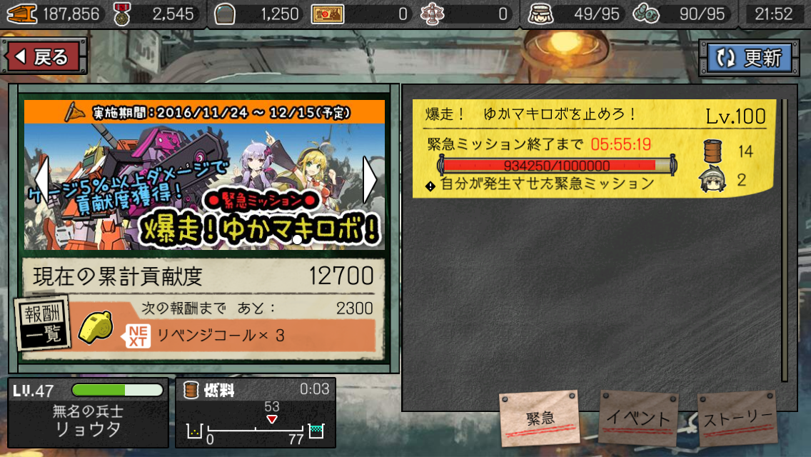 通常ミッションと異なり、戦闘に制限時間が設けられているので一度の出撃で倒しきれない仕様となっています。