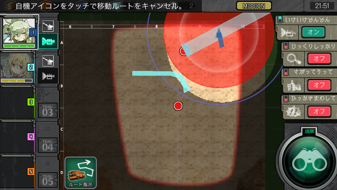 2班は攻撃範囲から回避行動を取りつつ、ゆかりロボの攻撃対象範囲から外れないように気をつけましょう。位置が悪い場合は近くのスキマに停車して、ゆかりロボの攻撃1回くらい受けても良いかも。(ゆかりロボのターゲットが1班になるよりはマシなので